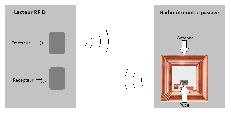 Les radio-étiquettes sont de petits objets, tels que des étiquettes autoadhésives, qui peuvent être collés ou incorporés dans des objets ou produits et même implantés dans des organismes vivants. Les radio-étiquettes comprennent une antenne associée à une puce électronique qui leur permet de recevoir et de répondre aux requêtes radio émises depuis l’émetteur-récepteur.